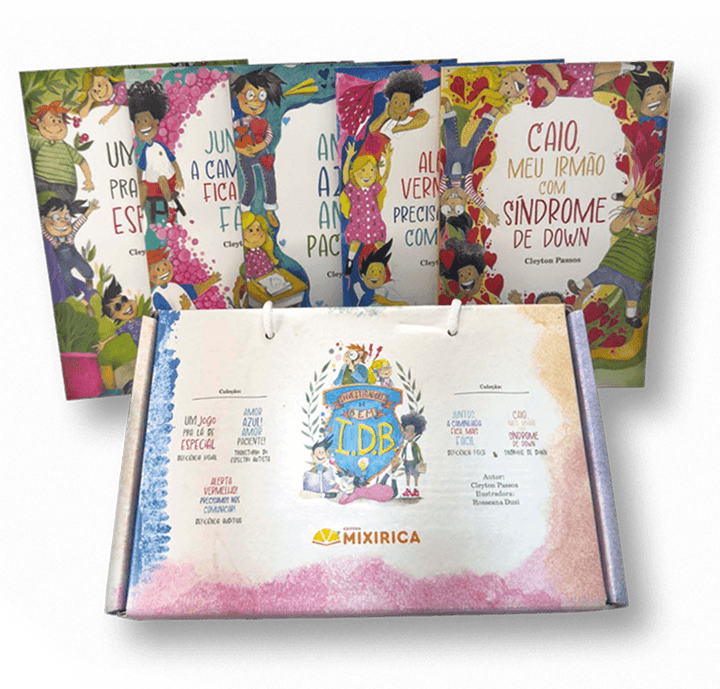 5 livros literários físicos, Organizador Pedagógico, Guia da Família e 1 cartela de adesivos dentro da caixa da coleção IDB.